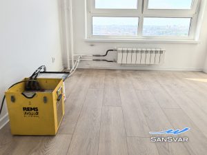 Несмотря на то что замена радиаторов с заморозкой труб происходит без сварочных работ, так как производить сварку рядом с охлождающими колодками нельзя, так как нагрев трубы может разморозить ледяную пробку которая держит воду в трубе. Тем не менее, с учётом подготовительных работ это довольно грязный работа… удаление краски, зачистка труб, резка труб, нарезка резьба в случаи резьбовых соединений с использованием масло от нарезка резьбы (СОЖ), стружка, окалины от срезания старых кронштейнов которые пристрелены в бетон и их можно только спиливать болгаркой, остатки теплоносителя из труб чёрно мазутного цвета которая плохо отмывается. Если квартира в стадии ремонта или пред ремонтном состоянии то это отлично, если квартира с отделкой то требуется более деликатная работа с сохранением отделки, но это не проблема, так как можно обезопасить места работы проклеив плёнкой полы в рабочей зоне и станы непосредственно в местах установки новых радиаторов. А вот если квартира жилая, имеется в виду с мебелью … диваны, кровати, шкафа, комоды вот это действительно большая проблема, так как не позволяет организовать рабочую зону, где будут производиться все основные подготовительные работы ну и доступ к стоякам и месту установки новых радиаторов.